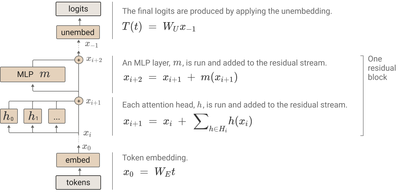 “A transformer starts with a token embedding, followed by a series of “residual blocks”, and finally a token unembedding. Each residual block consists of an attention layer, followed by an MLP layer. Both the attention and MLP layers each “read” their input from the residual stream (by performing a linear projection), and then “write” their result to the residual stream by adding a linear projection back in. Each attention layer consists of multiple heads, which operate in parallel.” A Mathematical Framework for Transformer Circuits