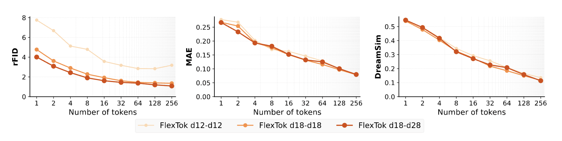 Figure 5: FlexTok rate-distortion tradeoff. We show ImageNet-1k reconstruction metrics for three different FlexTok sizes. The more tokens used, the closer the reconstructions get to the original RGB images. Scaling the tokenizer size significantly improves reconstruction FID, but is not as crucial in terms of MAE and DreamSim score. For each of the different FlexTok model sizes we use the optimal inference hyperparameters detailed in Appendix F. We show additional reconstruction metrics in Table 8.