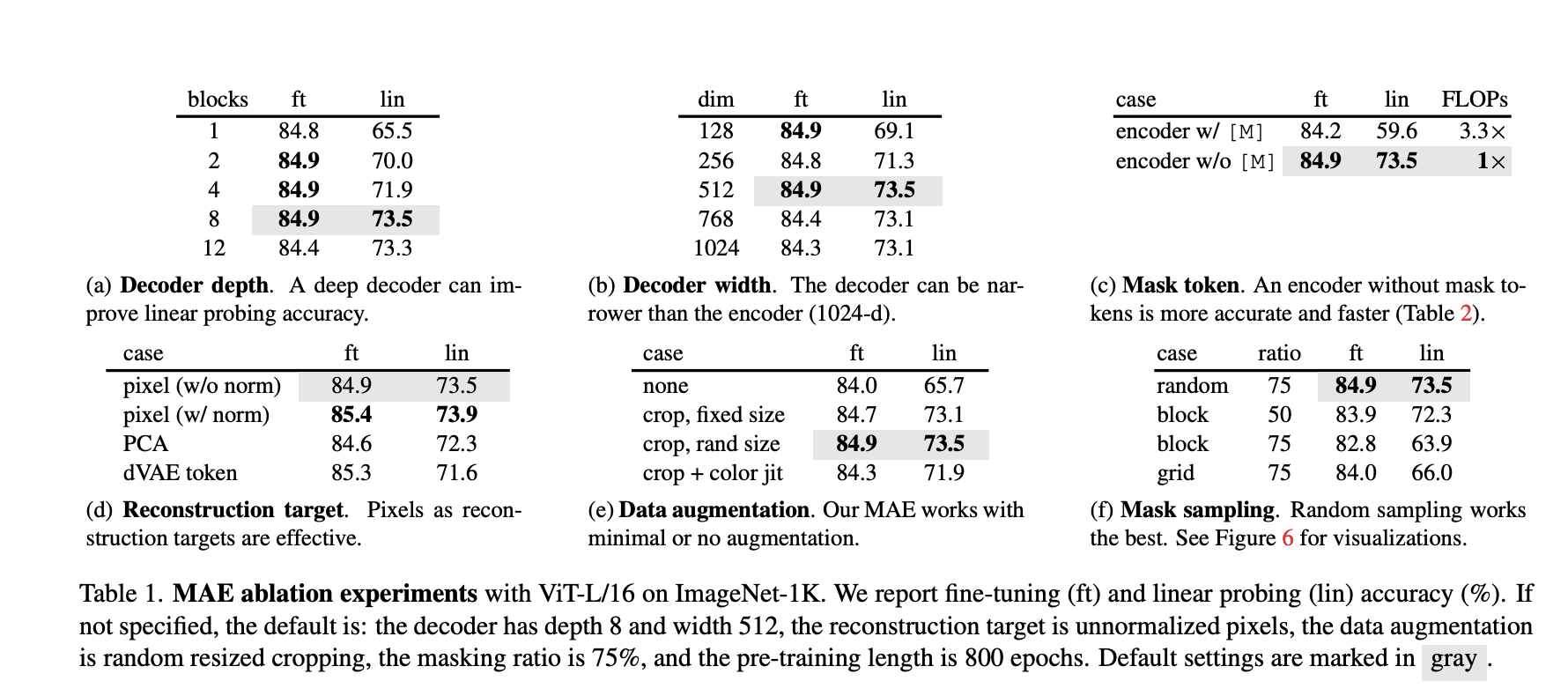 - The role of decoder depth in MAE-like models: Decoder depth is important for linear probing accuracy but not so much for finetuned accuracy: